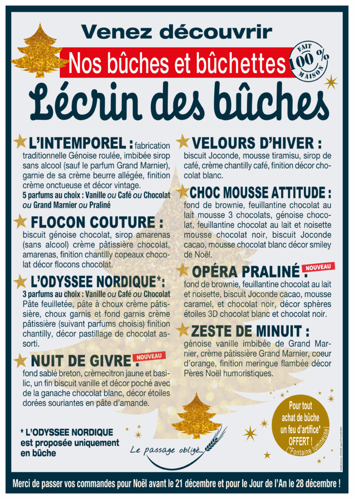 Noël 2025 approche à grand pas à la boulangerie ! Faites votre choix parmi nos bûches et bûchettes artisanales